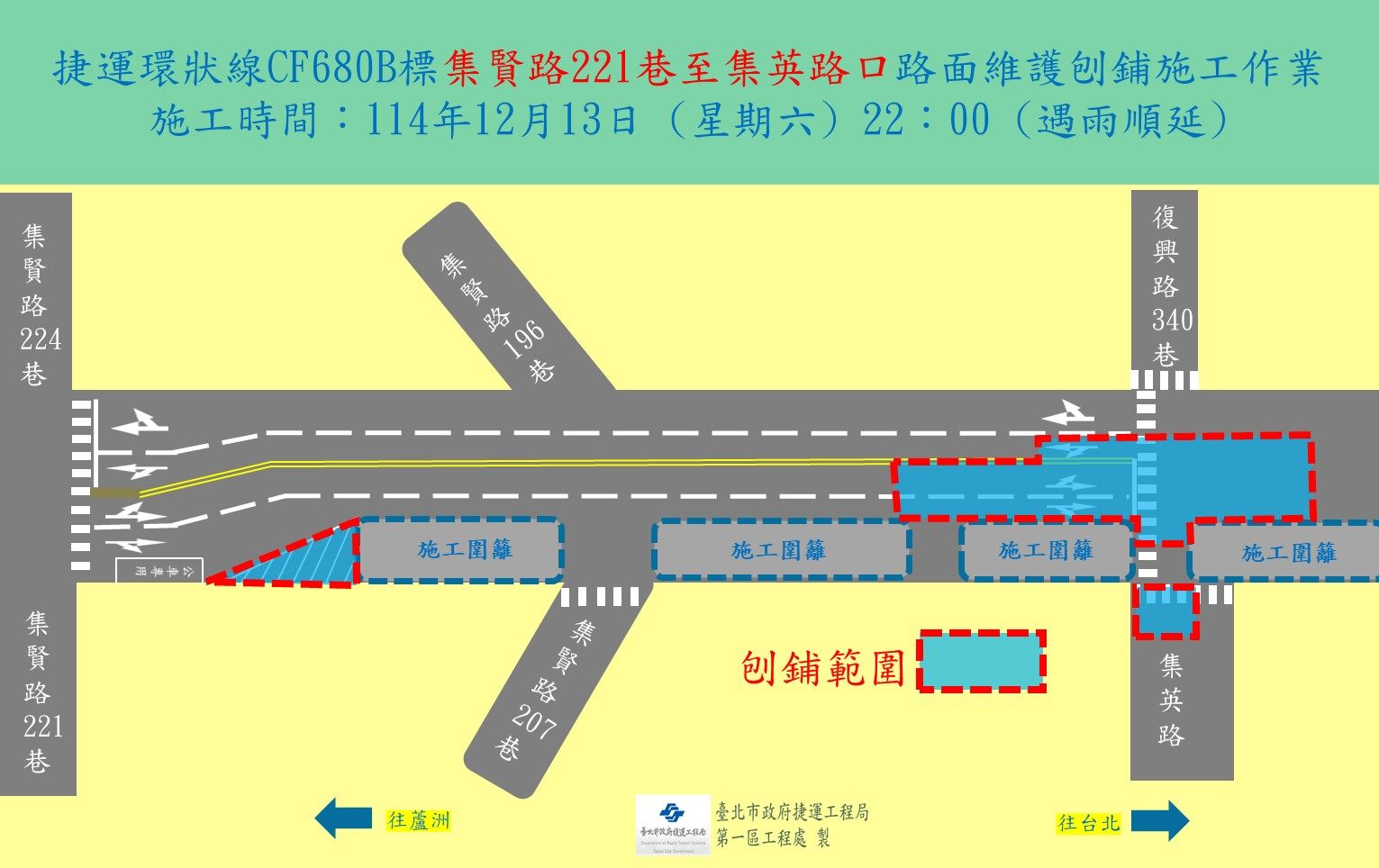 施工單位將自114年12月13日(六)夜間22時起,進行中央避車線蘆洲區集賢路221巷至三重區集英路路面維護刨鋪施工作業,遇雨順延或擇日再施工,施工範圍如附圖。 施工作業期間請用路人行經施工區域減速慢行,並依改道後之宣導牌面、遵循導引標誌及現場指揮人員導引指示減速慢行,以確保行車安全。施工期間民眾如有任何問題以及建議事項,或想瞭解最新施工動態,可隨時利用下列聯絡電話反映,將有專人竭誠為您服務與解說,施工造成暫時不便,敬請見諒。
